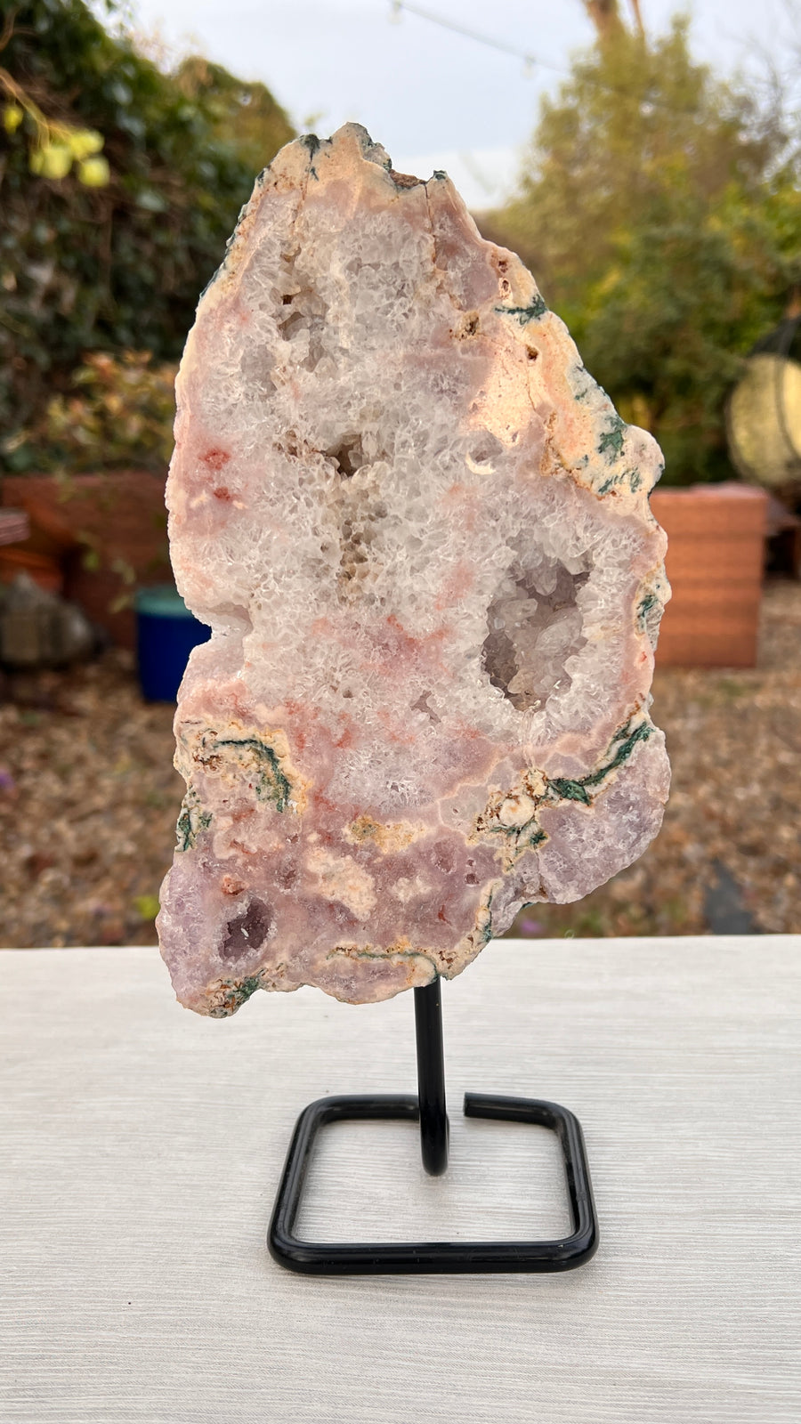 Discover the mesmerizing beauty of this natural Pink Amethyst slab. This stunning piece showcases a captivating blend of soft pinks and deep purples, creating a truly unique display. The intricate patterns and formations within the crystal are a testament to the wonders of nature. Pink Amethyst is believed to possess calming and soothing energies, making it a perfect addition to any space seeking tranquility and harmony. This large slab is an ideal statement piece for your home or meditation space.