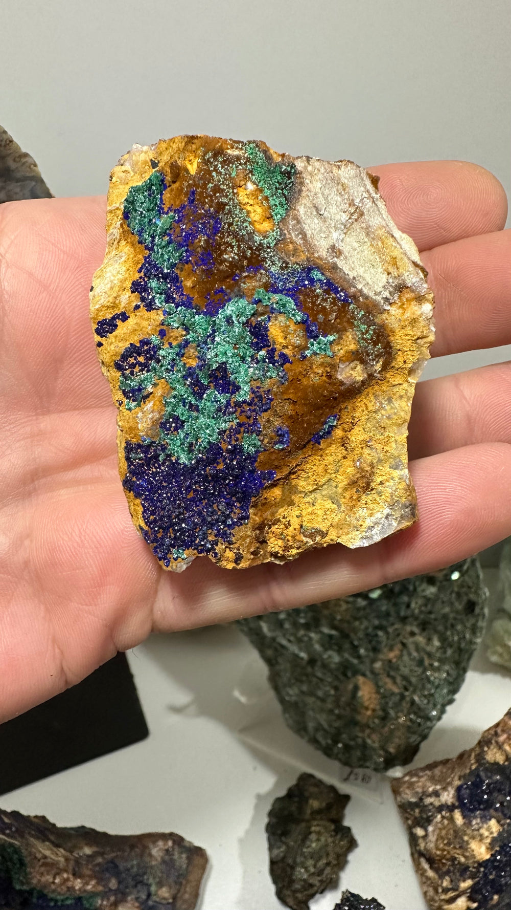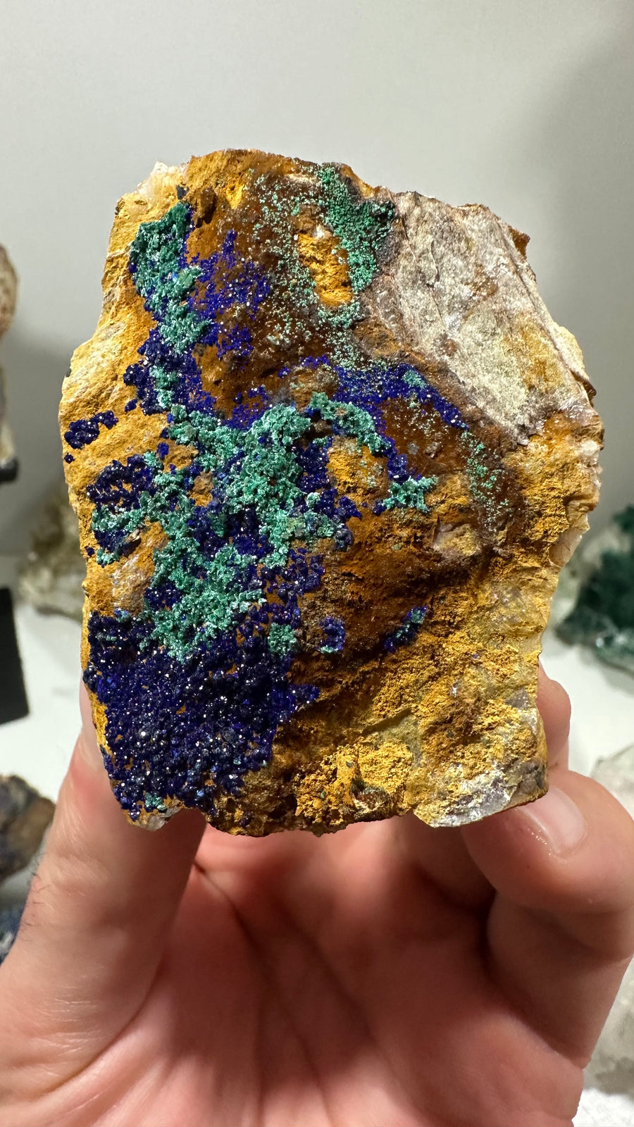 We select distinct crystals based on colour, structure, or pattern. Our devotion to uniqueness means our collection is filled with extraordinary finds. This Malachite Azurit crystal is special to us; its shape reminds us of a sparkling Earth, a dream world. Malachite and Azurite are often found together, forming "azurite malachite stones ." They grow close or mixed together. The result is a visually stunning stone in dark blue and vibrant green. It's highly desirable to collectors and is often referred to as "blue malachite" or "malachite azurite crystal ." The stones are cherished in the mineral world for their unique beauty.