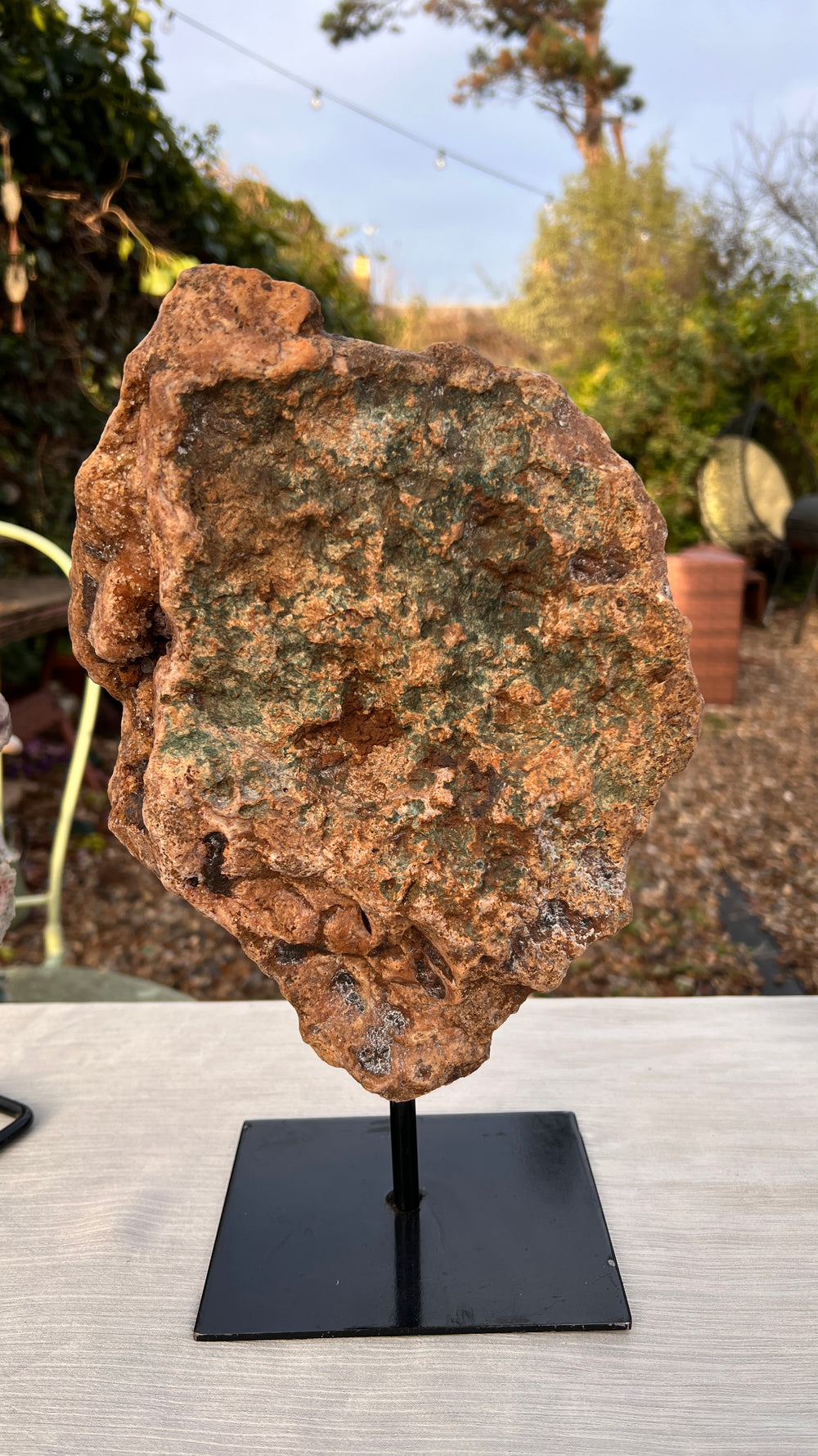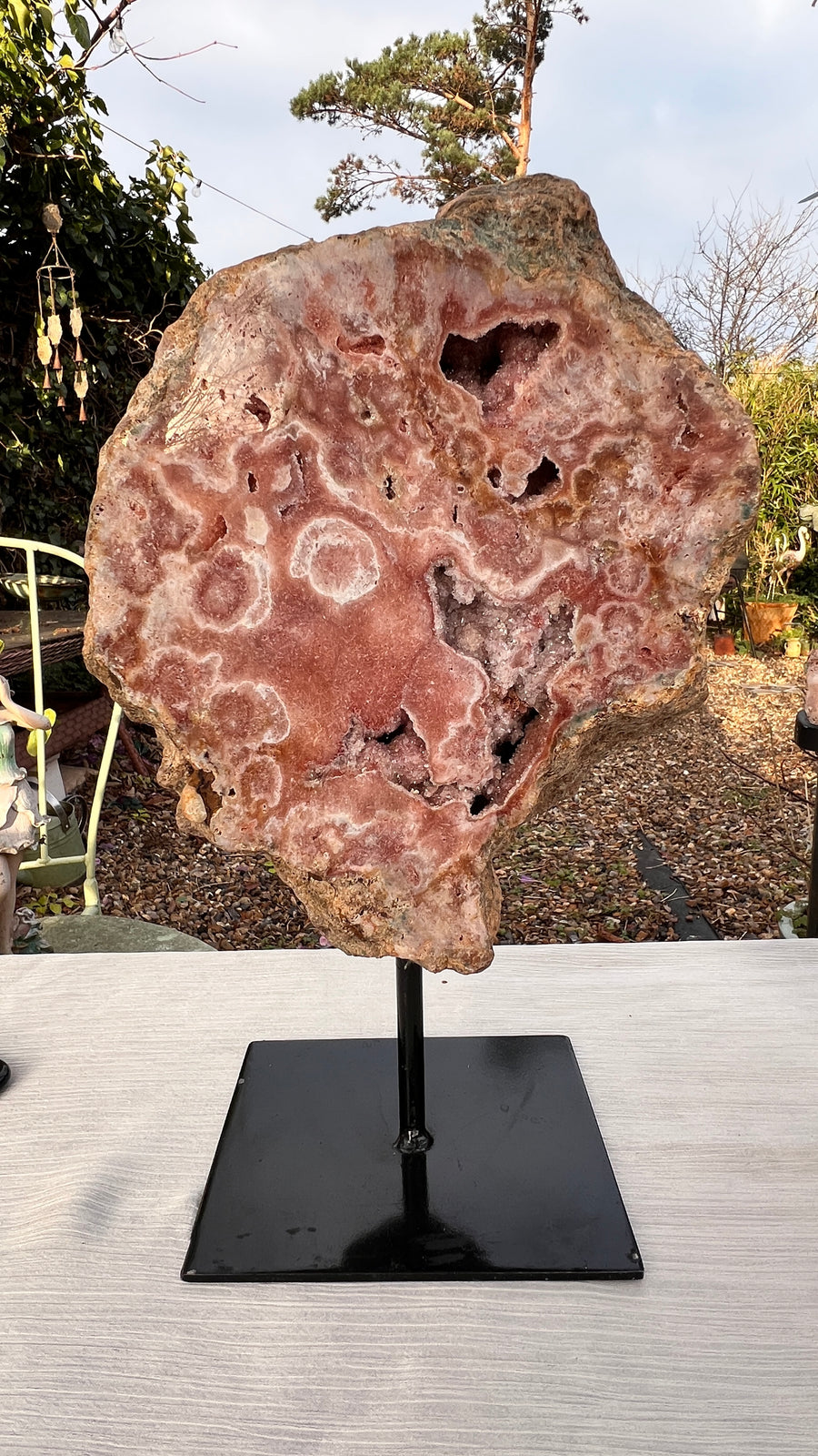 Showcase the natural beauty of this unique Pink Amethyst stone, featuring exquisite pink tones and organic formations. Measuring 34 cm in height, 20 cm in width, and weighing 3.5 kg, this stunning piece is elegantly displayed on a sturdy black metal stand. Perfect for home decor, spiritual practices, or as a statement piece in any setting.