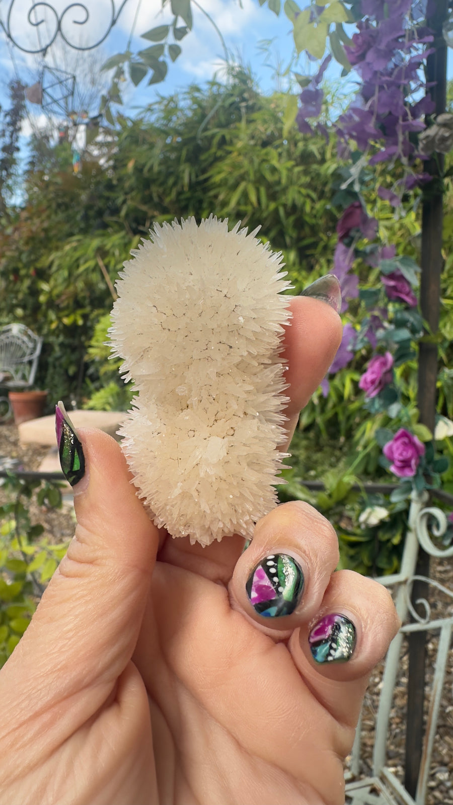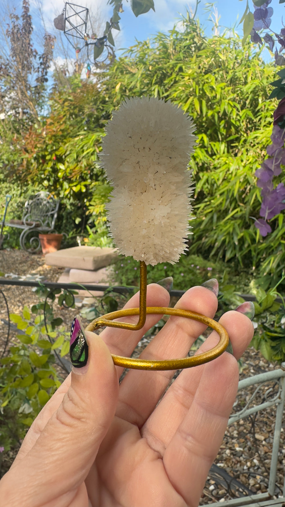 This stunning white quartz crystal cluster from Indonesia features intricately formed spiky crystals. Mounted on an elegant gold-colored stand, it makes a perfect decorative accent.